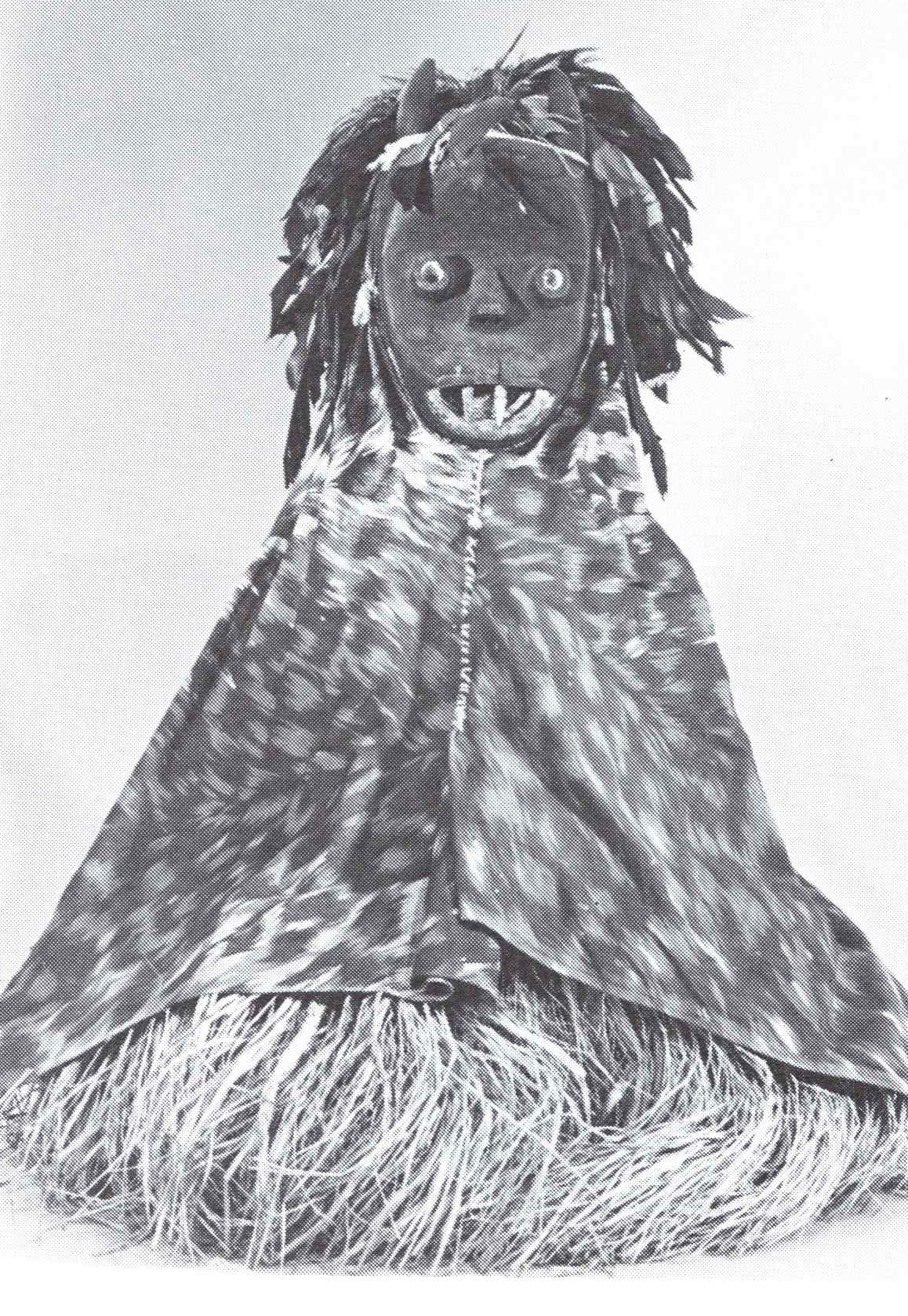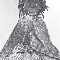 The wooden “mask” is carved as part of the total figure which has articulated arms and legs beneath the costume. The torso has a hollow chamber covered with a metal plate inside of which is an object which rattles when the figure is moved.