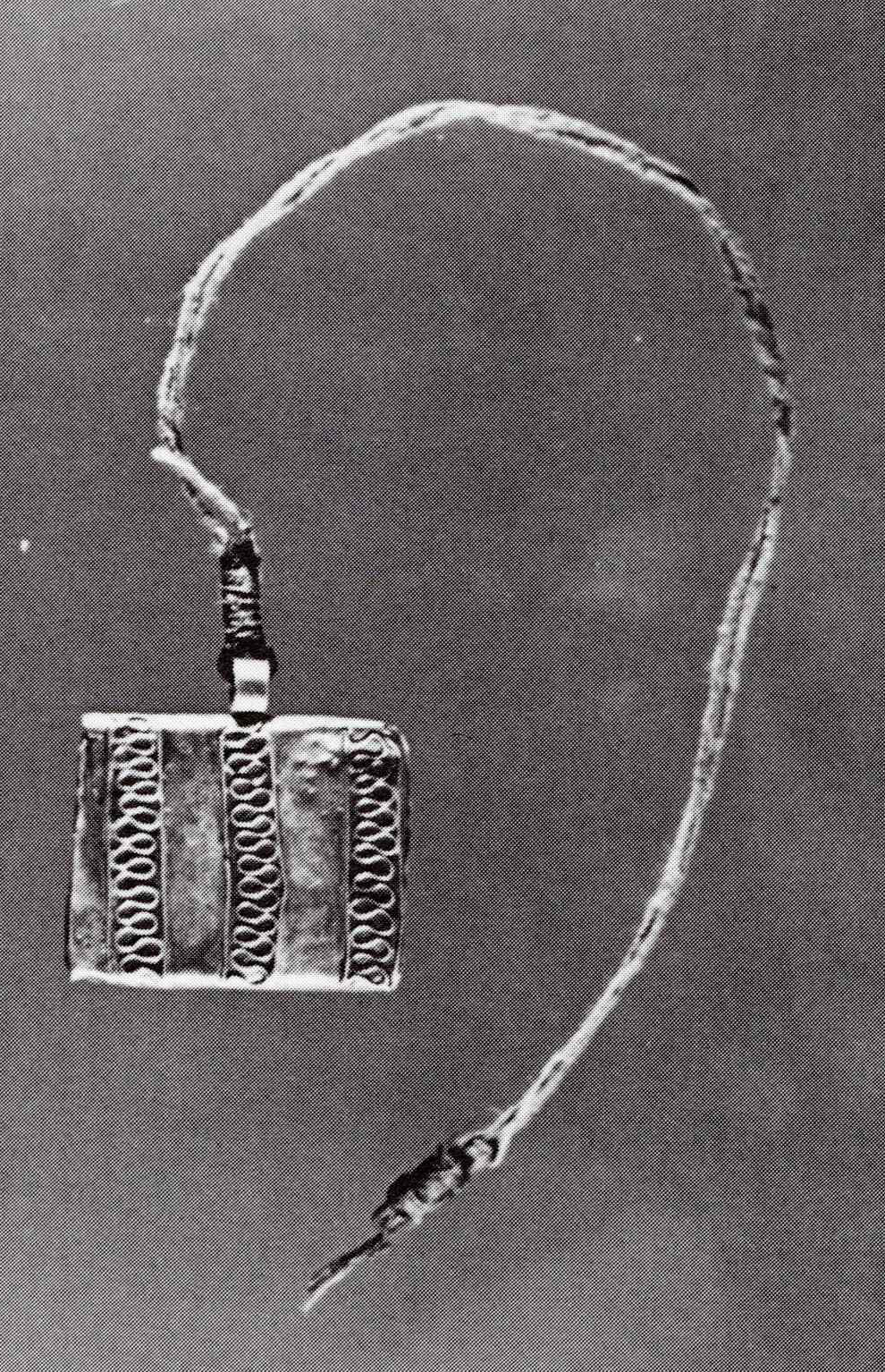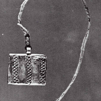 This piece is made from a single sheet of hammered silver, folded into the form of a packet. The design on the front is made with fine silver wires which have been melded on. It is said to have been worn by a paramount chief early in this century.