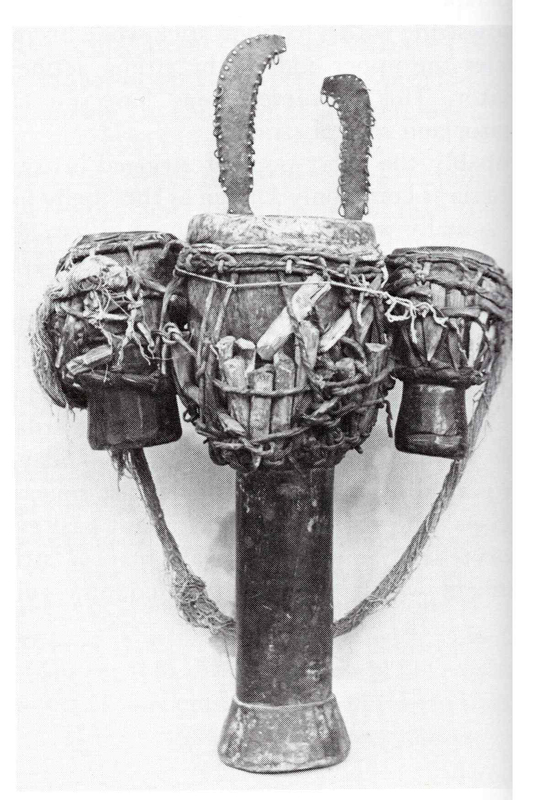 - A rattle, made from a strip of metal edged with metal rings, is attached to the middle drum.