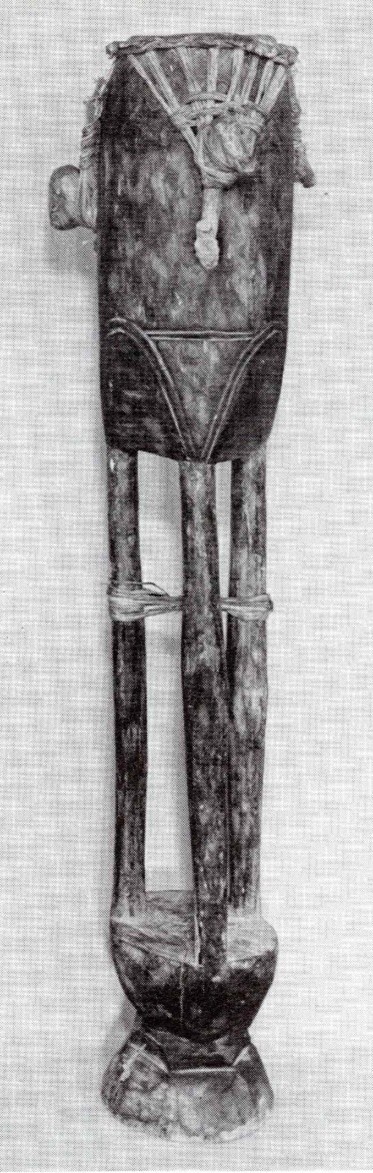 - The base and legs of this drum are carved from the same piece of wood. The head is fastened with fiber rope to three wooden pegs which fit into sockets in the sides of the drum.