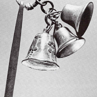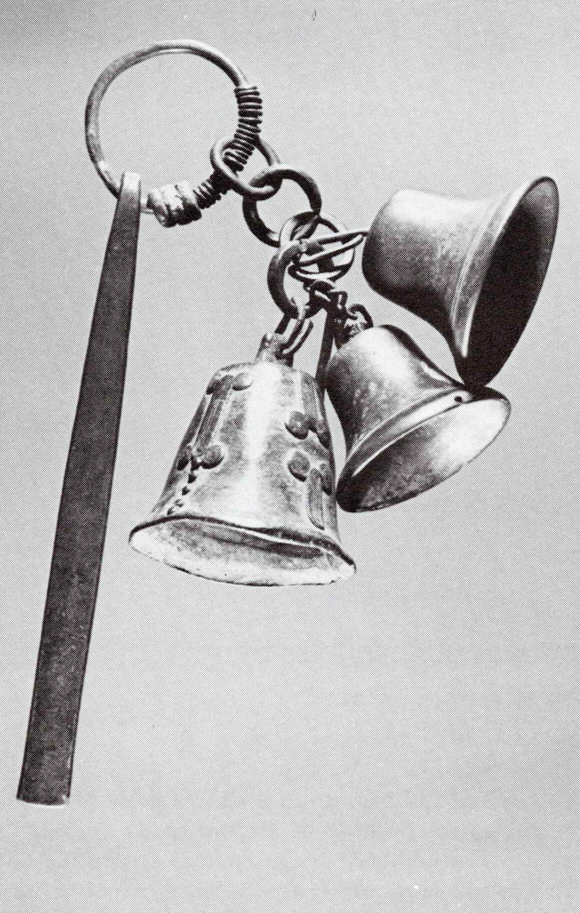 It is composed of two imported European bells and a locally made, decorated bell cast using the lost wax technique. All three bells are suspended by a brass and copper chain from a brass ring partially wrapped in copper which is attached to a bar of copper.