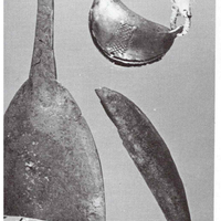 Dimensions given as L. 10 in/25.5 cm. L. 2 ¾ in/7 cm. D. 2 in/3.7 cm. The large iron bell with a clapper is from Nimba County. The Loma used this brass dogbell for hunting. The neckband is made from animal fur and is tied to the bell with raffia fiber. Gong is Loma.