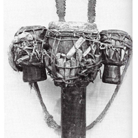 - A rattle, made from a strip of metal edged with metal rings, is attached to the middle drum.