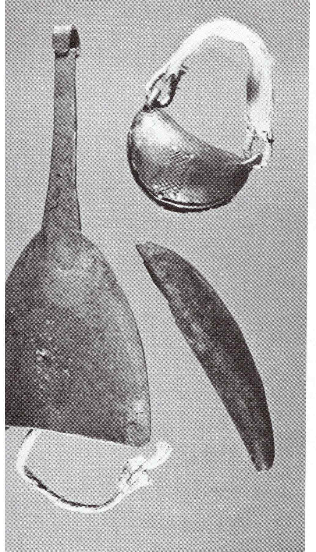 Dimensions given as L. 10 in/25.5 cm. L. 2 ¾ in/7 cm. D. 2 in/3.7 cm. The large iron bell with a clapper is from Nimba County. The Loma used this brass dogbell for hunting. The neckband is made from animal fur and is tied to the bell with raffia fiber. Gong is Loma.